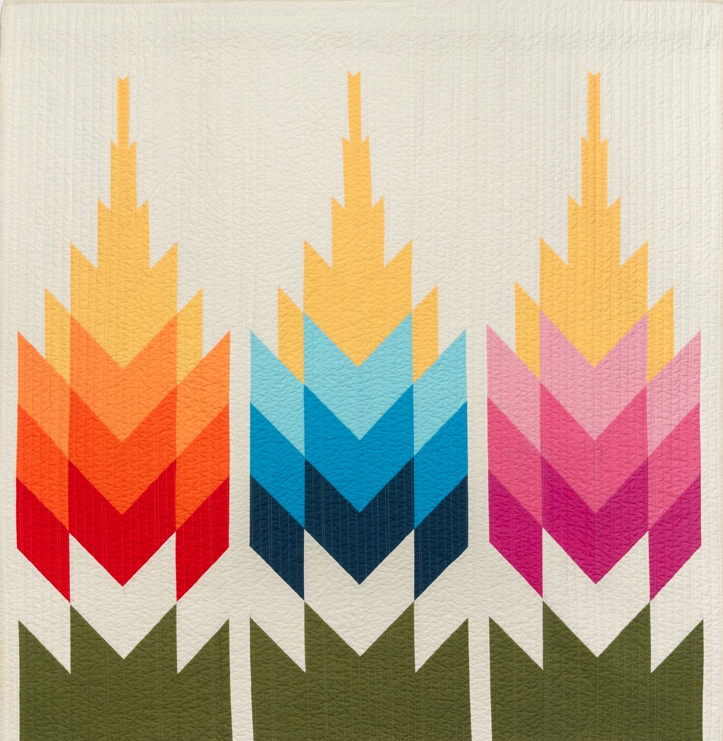 Inspired by the vibrant geometry of Mexican blankets and the agave fields of her husband’s heritage, this quilt—designed by Abigail Vargas—blends cultural roots with bold modern design. The original quilt was created as a gift for her husband and later exhibited at QuiltCon 2020 in Austin, TX.